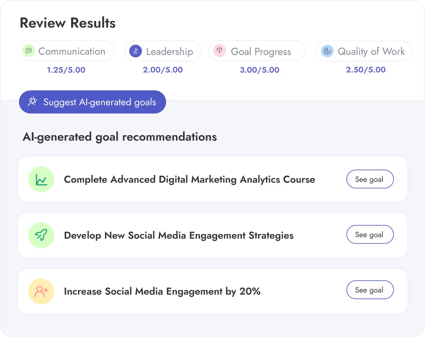 With the help of AI you can choose to create suggested goal examples that you can either directly implement or make edits as you set new objectives in light of your performance evaluation process.