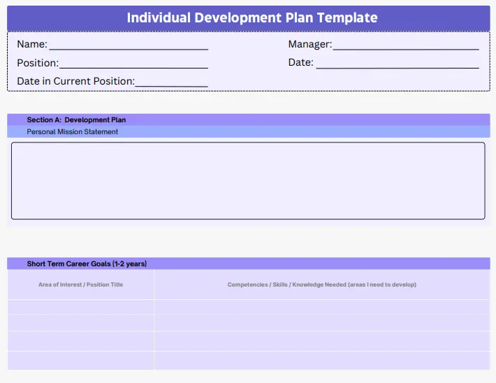 Career Goals: Specific short-term (e.g., mastering new skills in six months) and long-term (e.g., preparing for future roles like team lead in three years) objectives.