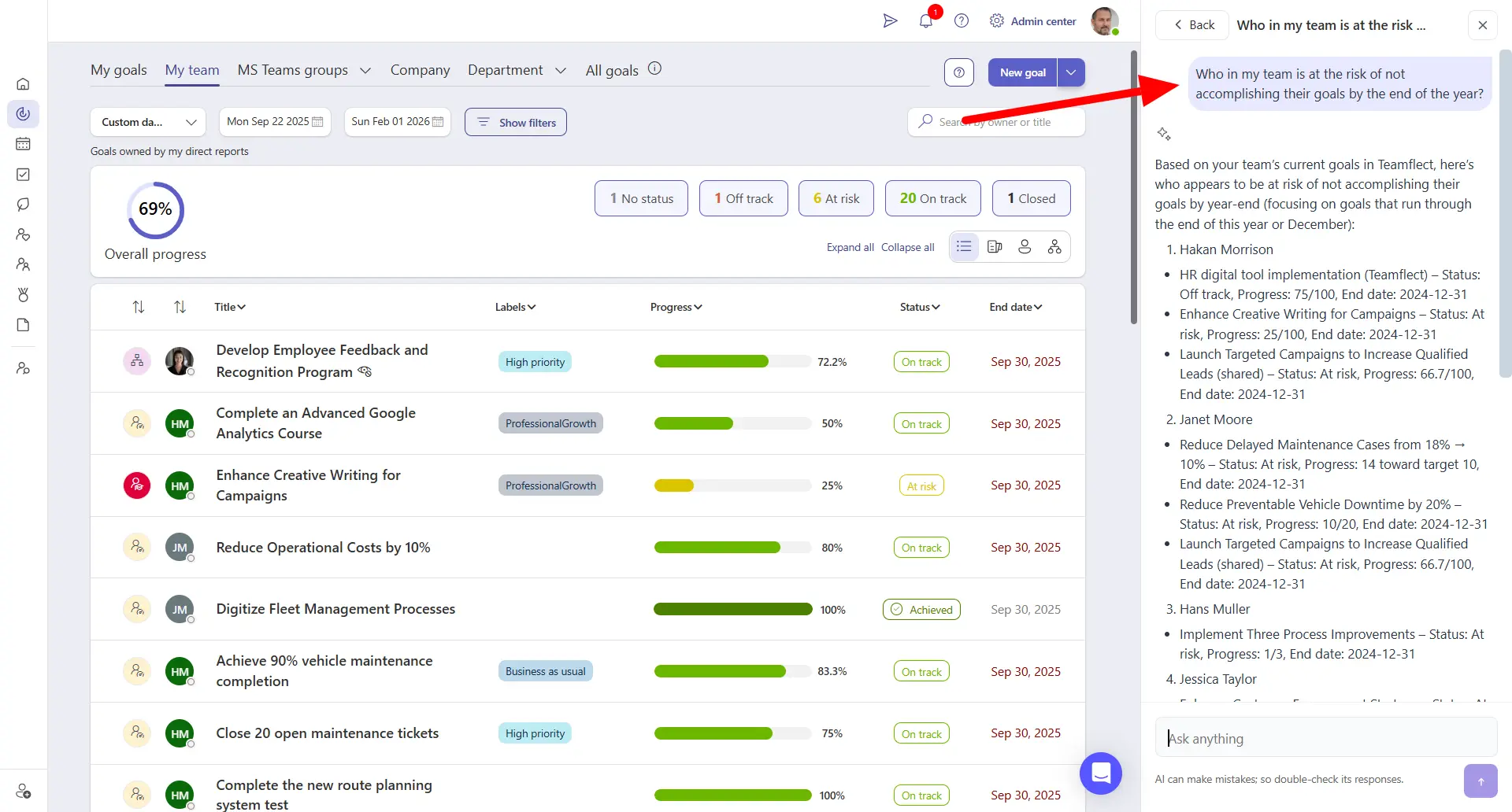 Instead of manually scanning progress bars or waiting until deadlines approach, managers can ask Teamflect Agent direct questions such as “Who on my team is at risk of missing their goals?”