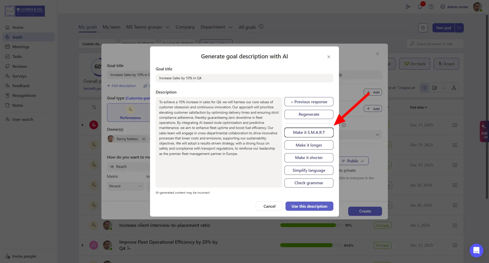 AI scores each goal for clarity and measurability, offering suggestions for improvement before finalization to ensure everyone understands the objective.