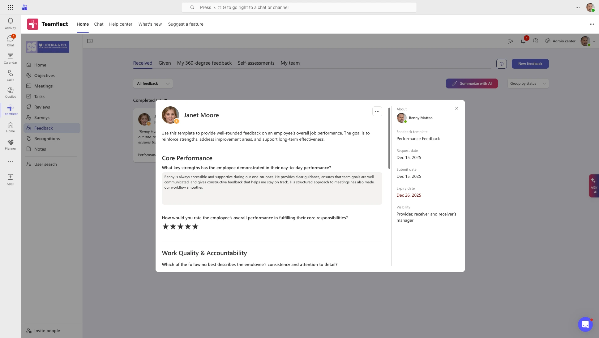 If your organization uses Microsoft Teams, Teamflect is purpose-built for your environment. It brings feedback, performance reviews, recognition, and goal management directly inside Teams, so nothing gets lost between tools.